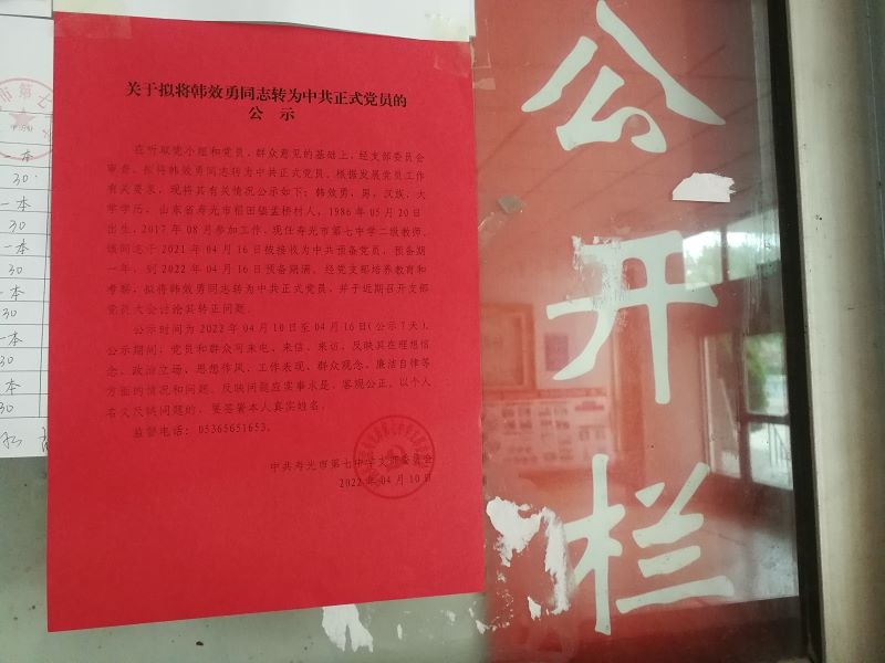 关于拟将韩效勇同志转为中共正式党员的公示