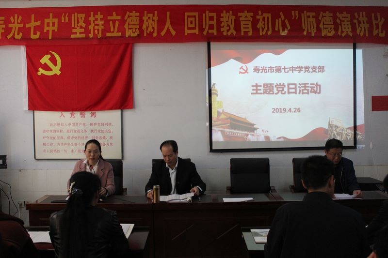 4月26日,寿光市第七中学党支部开展主题党日活动,结合党员教师工作实际,就不忘教育初心,坚持立德树人为主题,展开学习和讨论,支部书记胡少云同志,做了题为《坚持实践育人 发挥党员先锋岗作用》的报告。