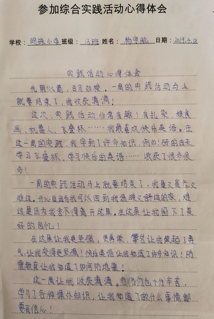 明珠小学杨宇航实践活动感言