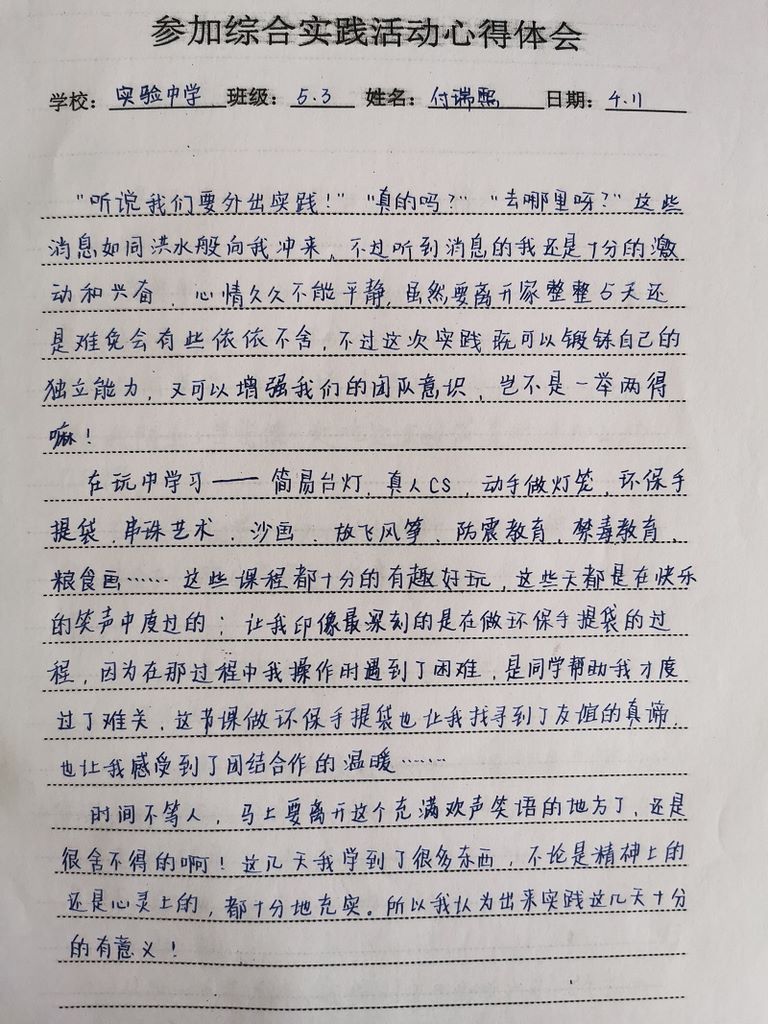 实验中学付瑞熙实践活动感言